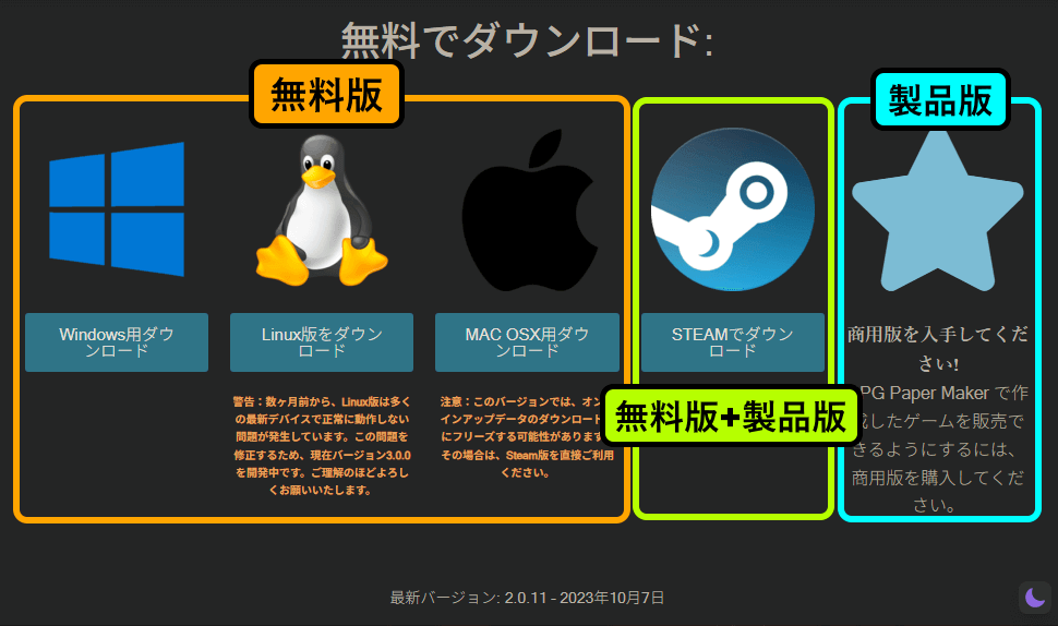 [無料版]と[製品版]の違いは「制作したゲームを販売できるか」だけなので、