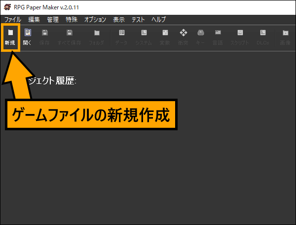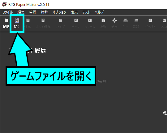 新規作成の右隣にある[開く]では、作成中のゲームファイルを開くことができます。