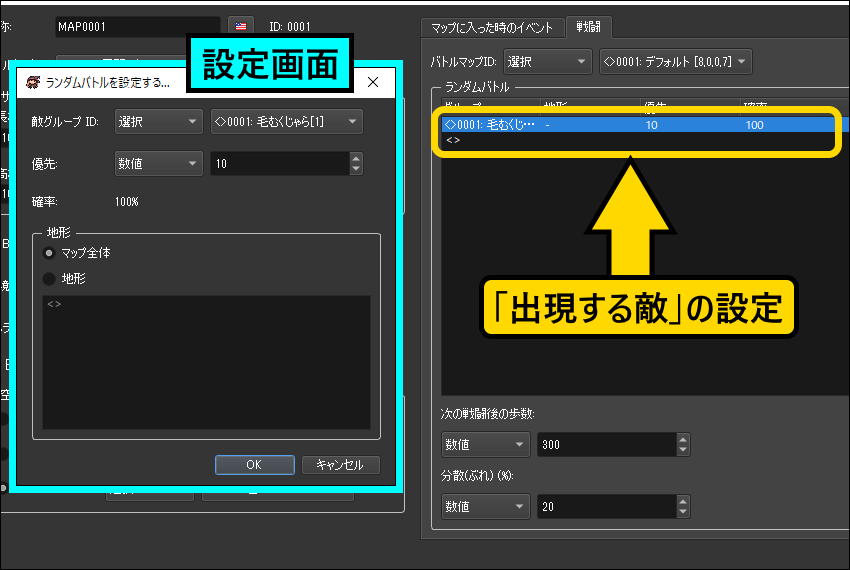 その場合は、あらかじめマップに出現する敵を設定しておくと良いでしょう。