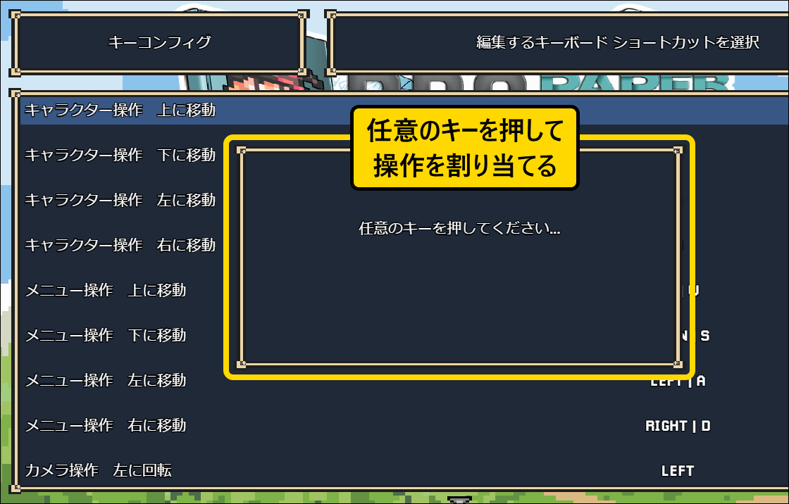 変更したい操作を選択してから、操作を割り当てるキーを押すと変更できます。