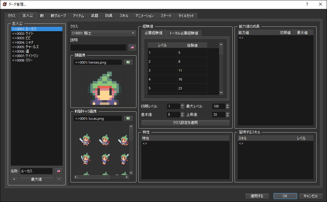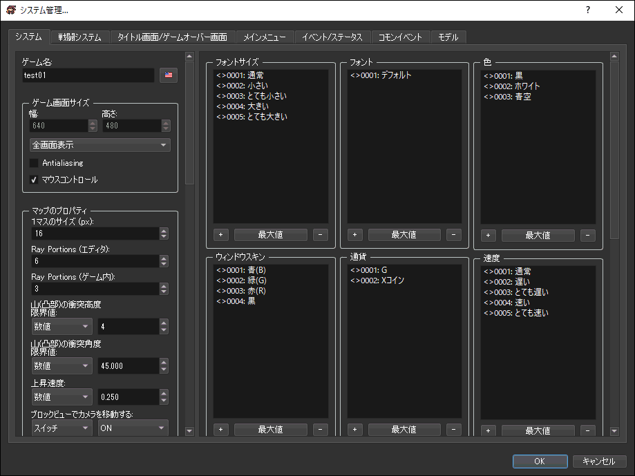 初期設定では、あらかじめRPGに必要な項目や機能が用意されているので、