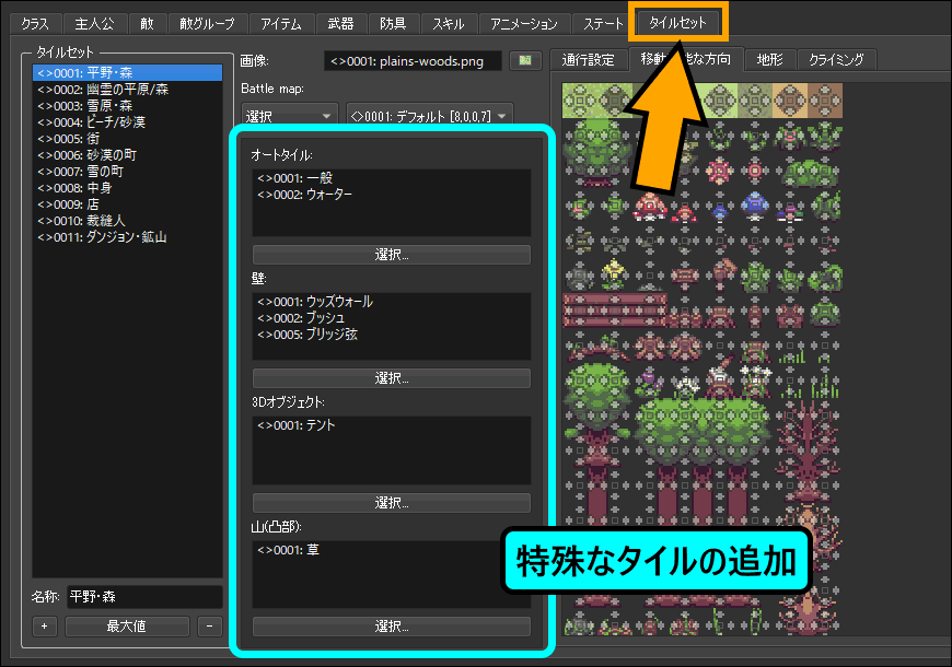 また、マップ作成に使用する「タイルセット」を設定することも可能です。