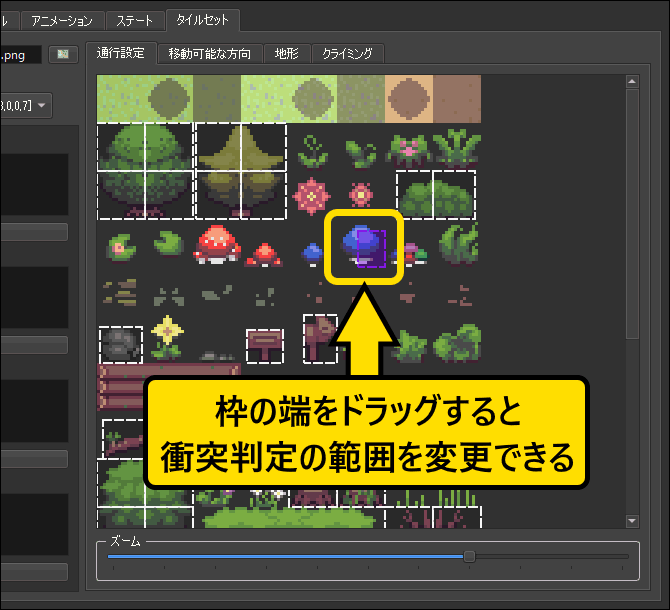 タイルにある衝突判定を示す枠の端をドラッグすると、衝突判定の範囲を変更することができます。