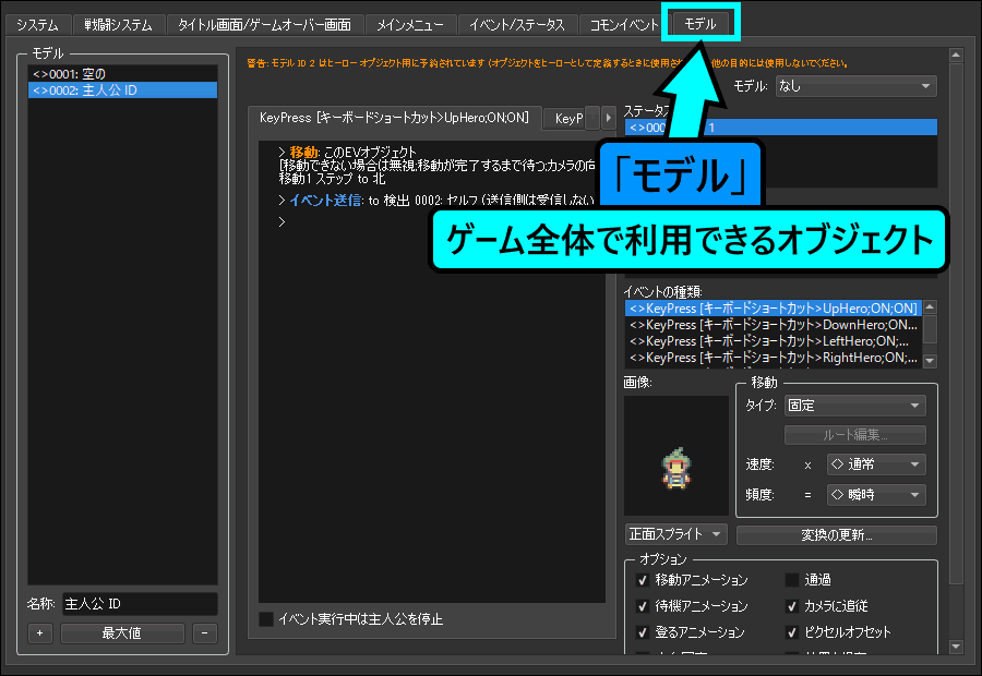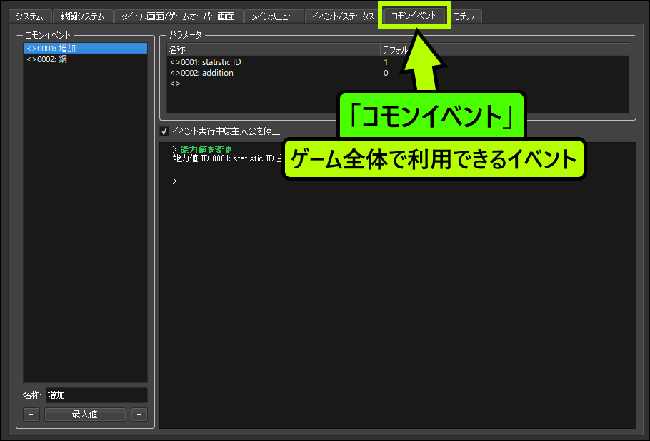 また、「コモンイベント」ではゲーム全体で利用できるイベントが、