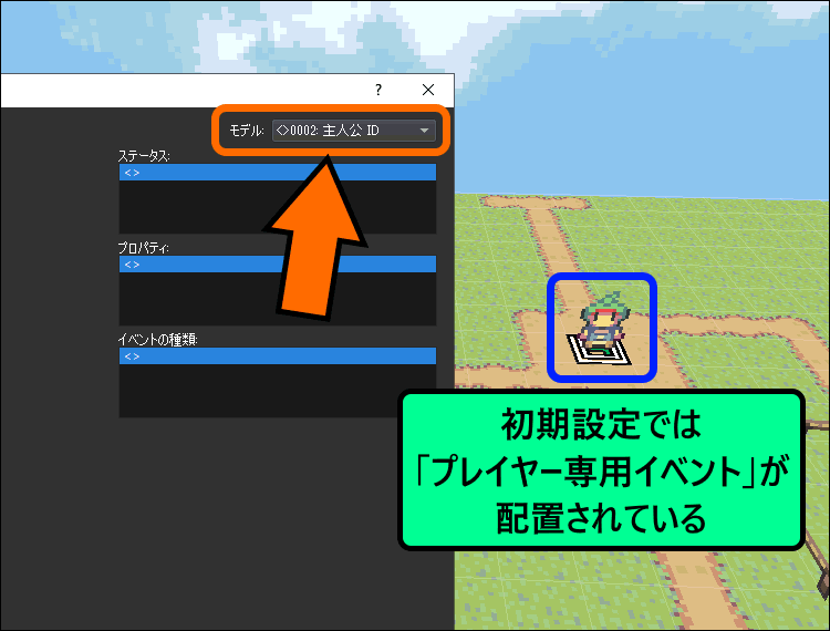 「0002:主人公ID」を使用したプレイヤー専用イベントが配置されています。