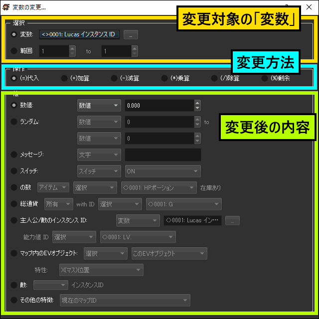 変数の内容については、イベントコマンドにある「変数の変更」から変更可能です。