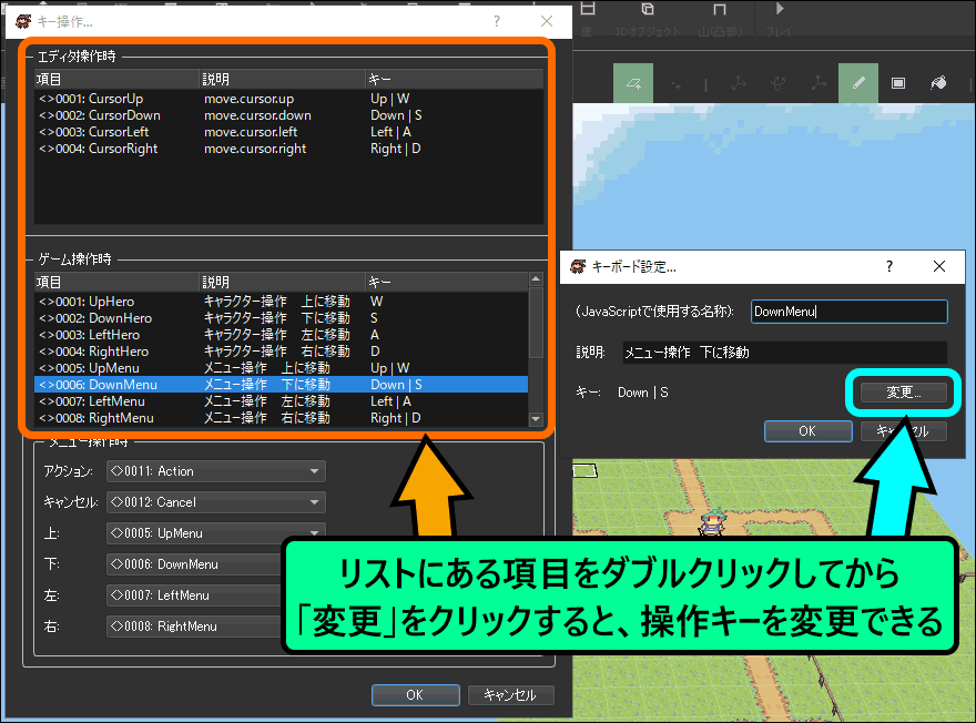 今回は、「マップ作成画面」を解説していきたいと思います。 マップを作る機能だけでなく、マップに関する様々な機能が用意されています。 タイルの配置 マップ作成画面では、タイル選択画面にあるタイルを左クリ …