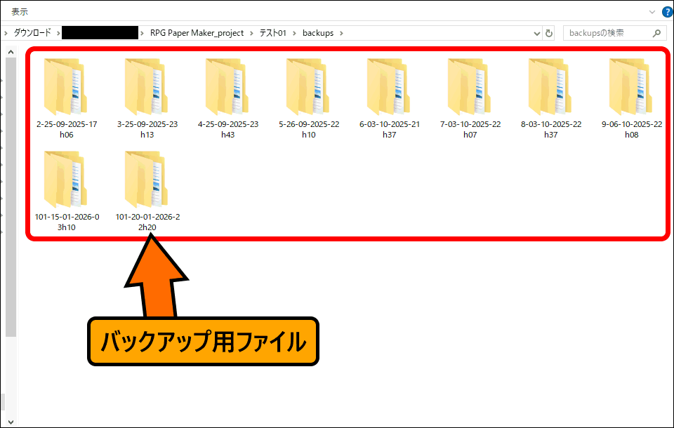 バックアップ用ファイルは、プロジェクトフォルダ内にある[Backups]に保存されます。