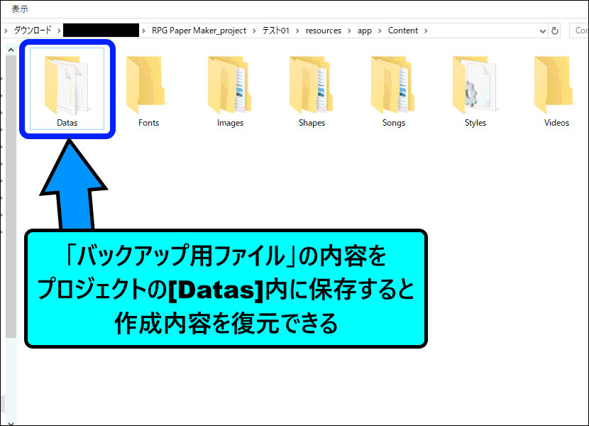 その中にある[Datas]の内容を、プロジェクトフォルダの[Datas]内に保存すれば、