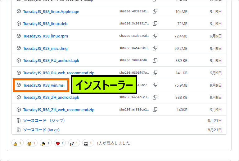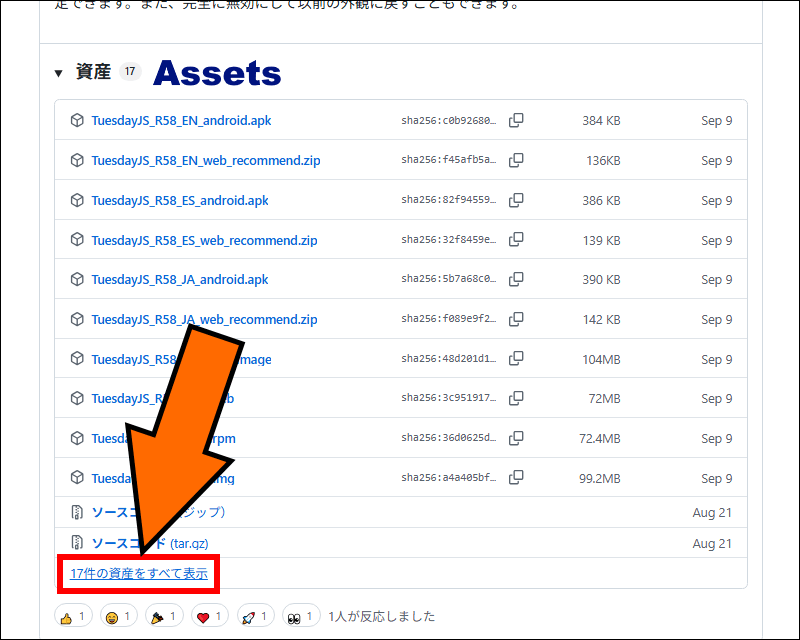最新情報の下側にある「Assets」の赤枠内をクリックして、