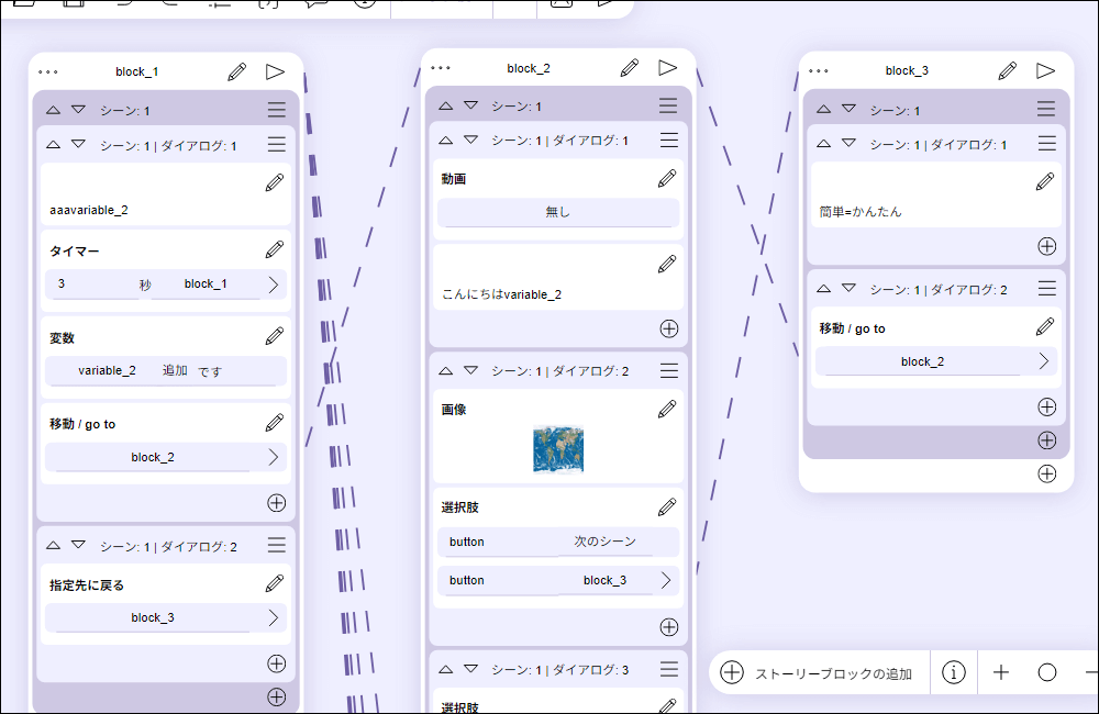 ゲーム内容を表示する「ブロック」と、ブロック同士の繋がりを示す「線」で構成されているので、
