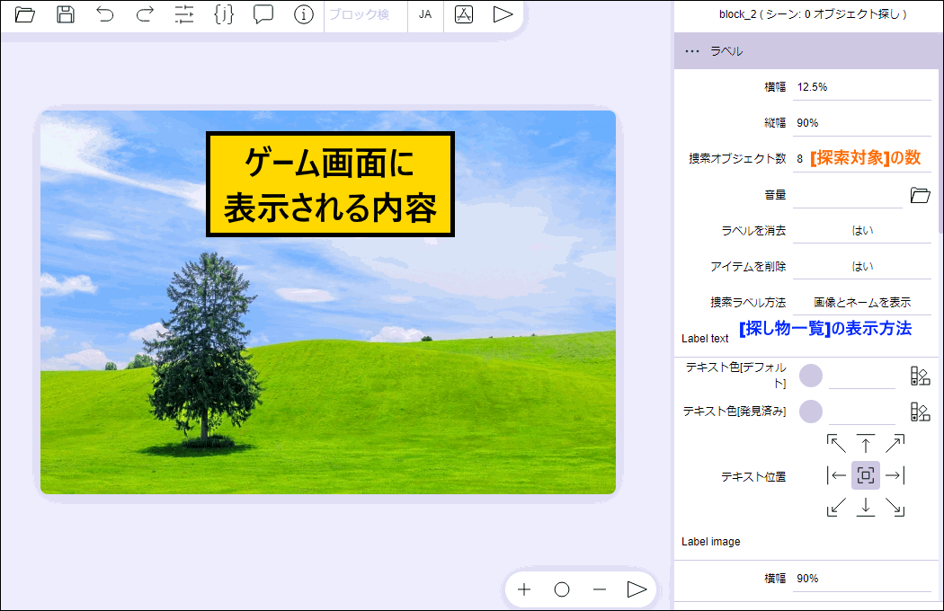 [ラベル]では「探索対象の数」や「[探し物一覧]の表示方法」が、
