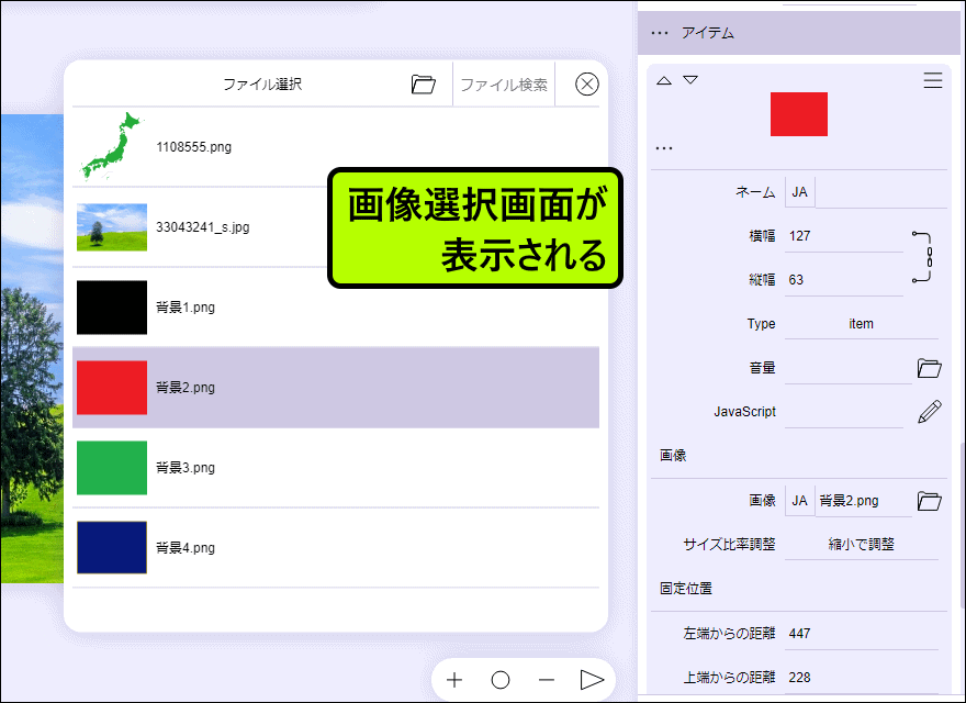 基本的な仕様は「地図表示」と同じですが、作成時に画像を選択する必要があります。