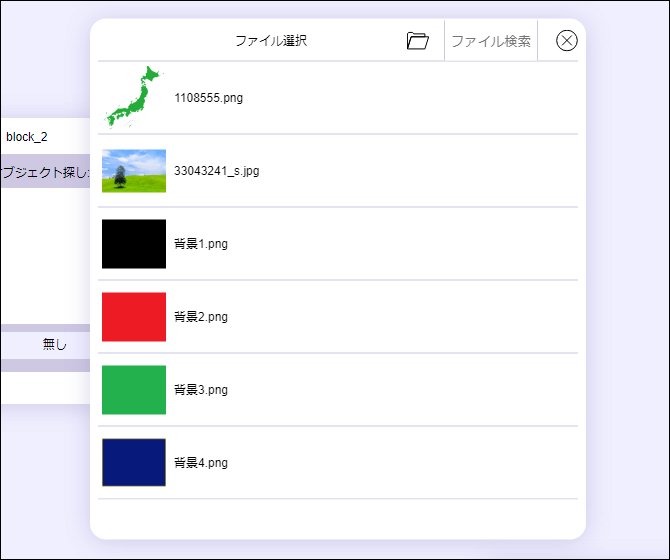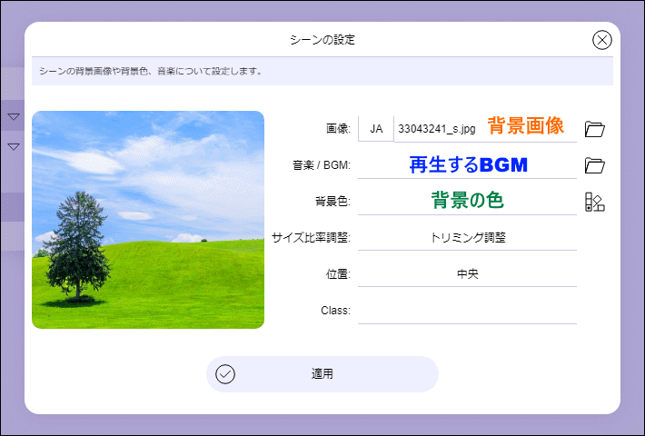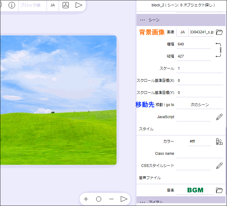 [シーン]では「背景画像」や「探索後の移動先ブロック」などが設定できます。