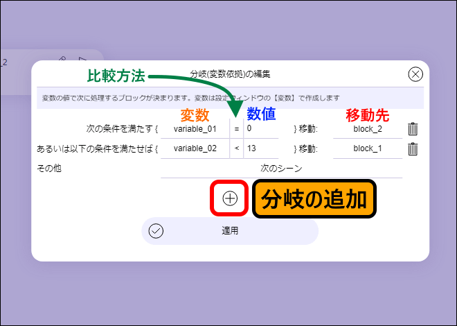 「変数」と「数値」を比較して、その結果によって移動先を変更できます。