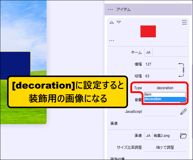 [アイテム]ではない画像を配置したい場合は、赤枠内の設定を[decoration]に変更します。